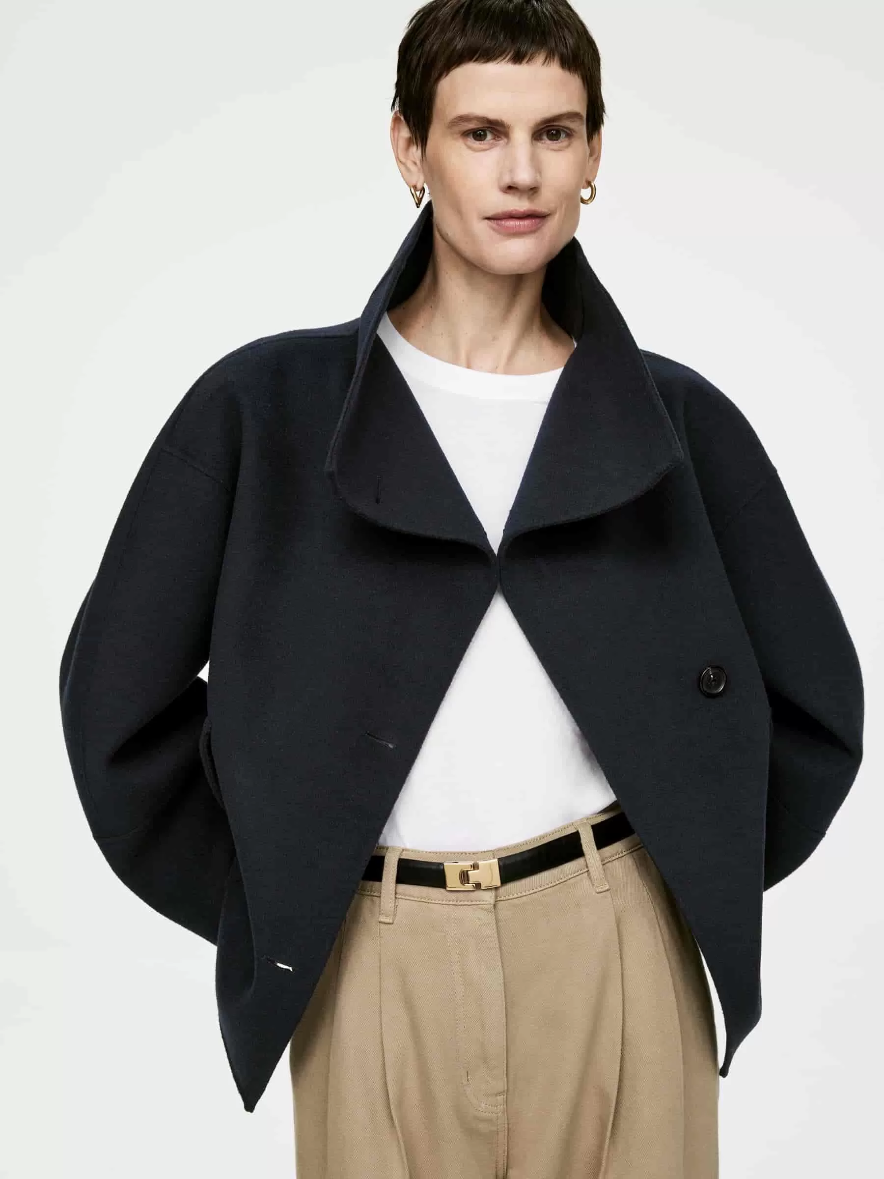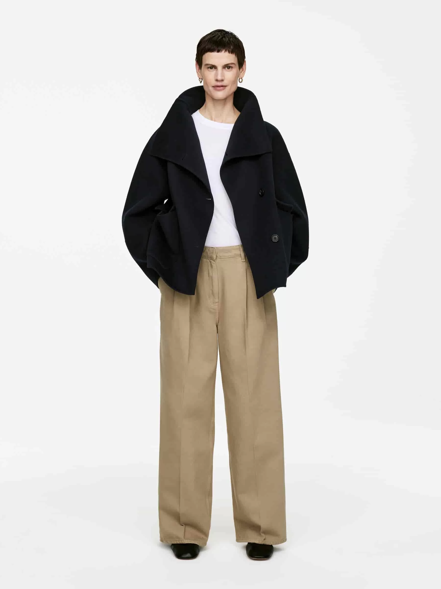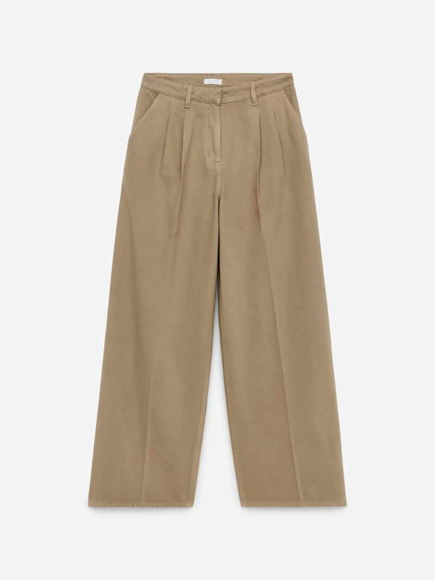 Wide-leg denim trousers crafted from a cotton-lyocell fabric with a washed finish. A tailored style with press creases at front and back. Hook-and-eye closure, slanted side pockets and welt pockets at the back.