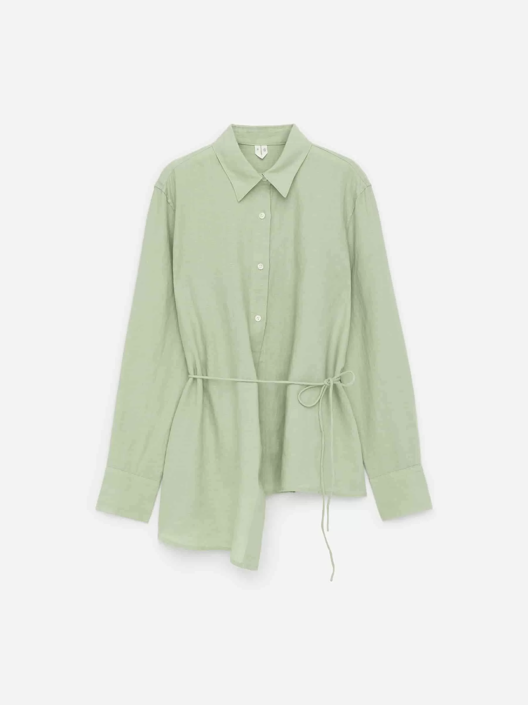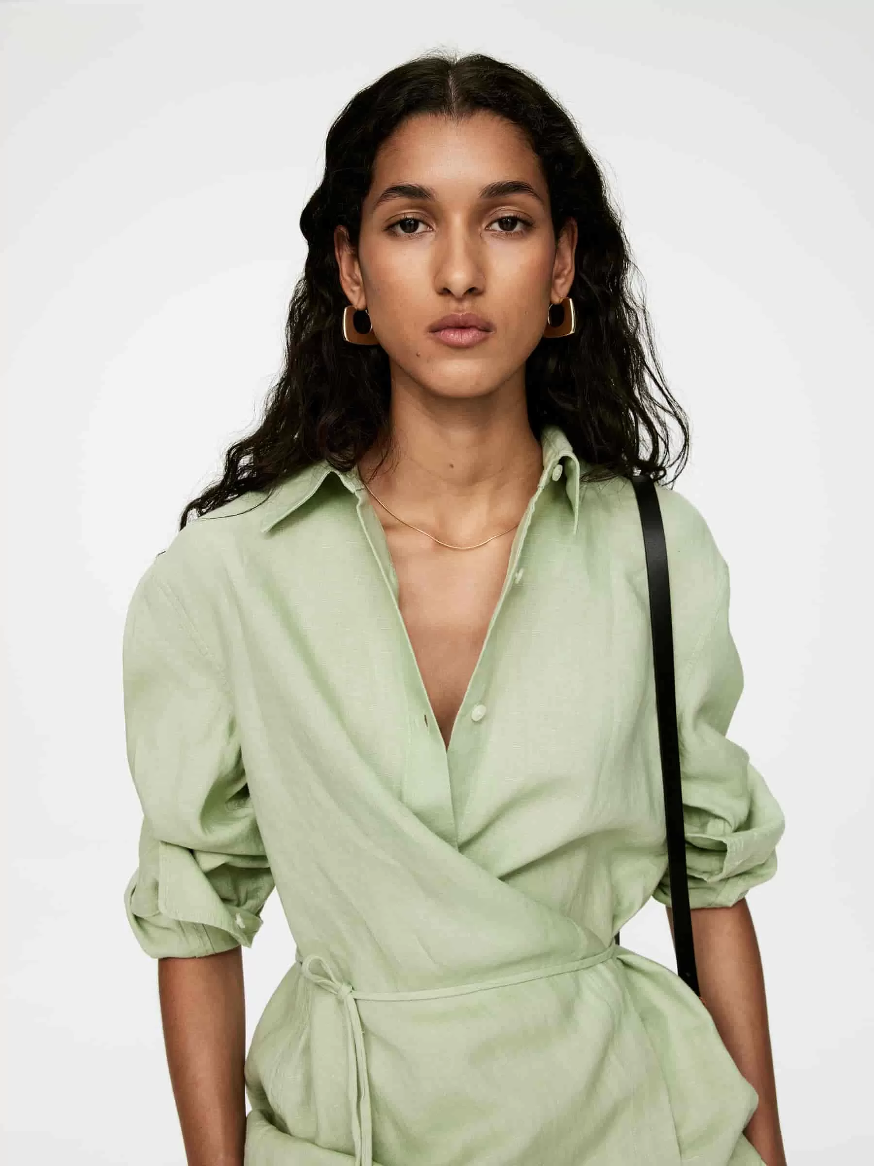 Wrap shirt crafted from linen. Styled with button closure and self-tie belt at waist. Slim fit.